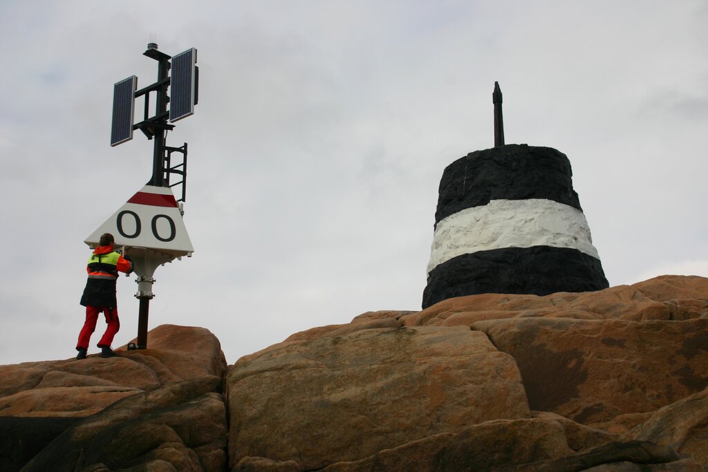 Person i sikkerhetsutstyr inspiserer soldrevet navigasjonsfyr på en steinete kyst nær et svart- og hvitstripete fyrtårn.