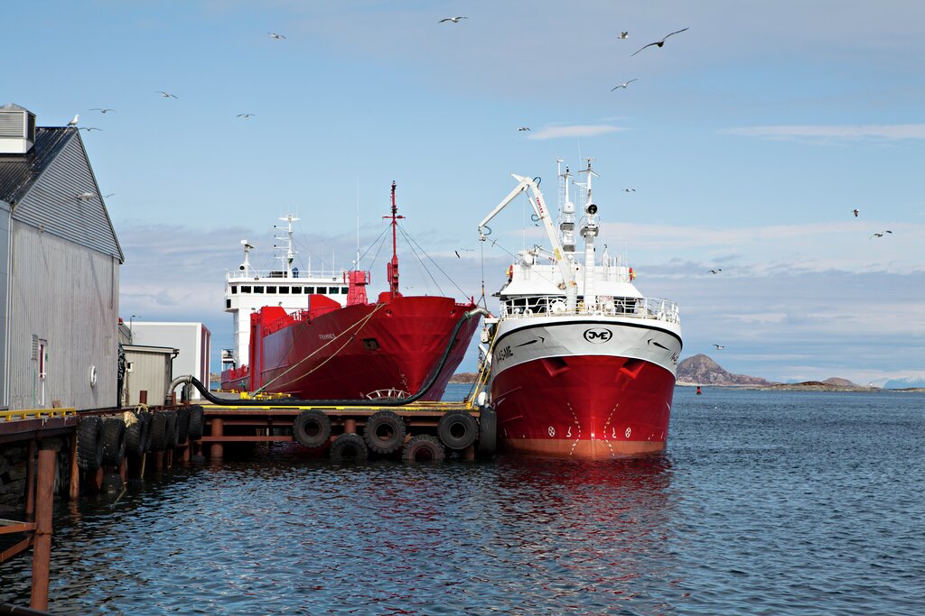 To røde fiskefartøy la til kai ved en brygge, måker flyr over dem, rolig hav og synlige fjell i det fjerne.