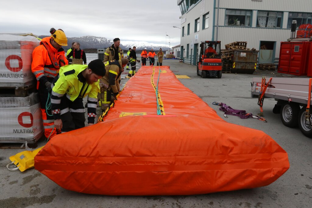 Nødpersonell forbereder stort oransje oppblåsbart utstyr på kaia. Arbeidere i refleksutstyr. Fjell og industribygninger i bakgrunnen.