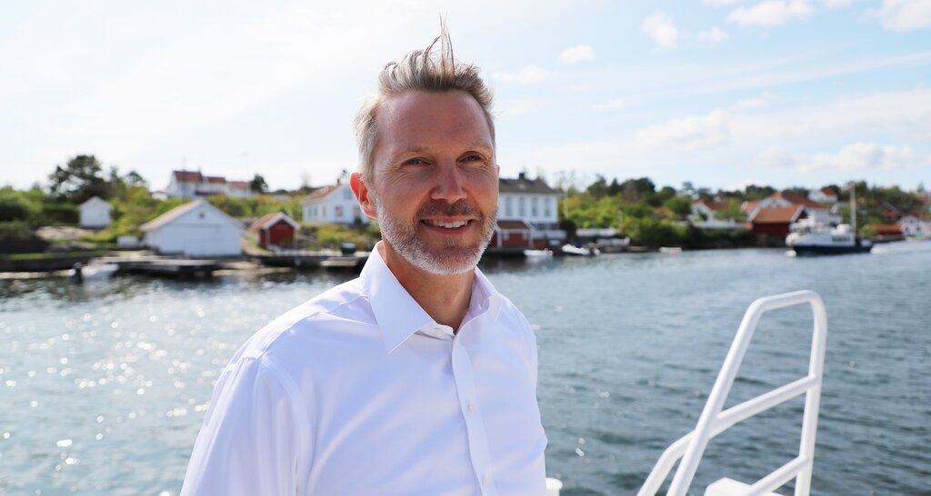 Middelaldrende mann med skjegg smiler på stranden, iført hvit skjorte og caps. Fyr synlig i bakgrunnen.