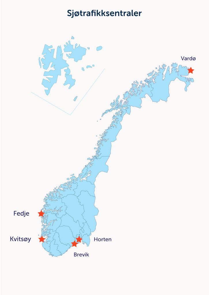 Kart over Norge som viser plassering av sjøtrafikksentraler: Vardø, Fedje, Kvitsøy, Horten og Brevik, markert med røde stjerner.