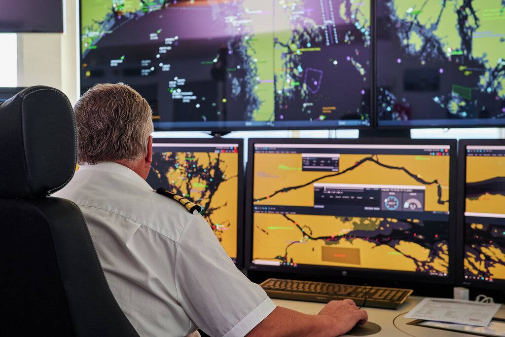 Offiser overvåker flere skjermer som viser kart, data og sporingsinformasjon i et kontrollrom eller operasjonssentral.