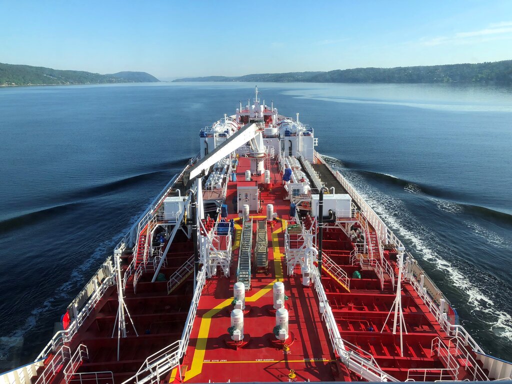 Luftfoto av et rødt oljetankskip som seiler gjennom rolig farvann med skogkledde kystlinjer synlige på begge sider.